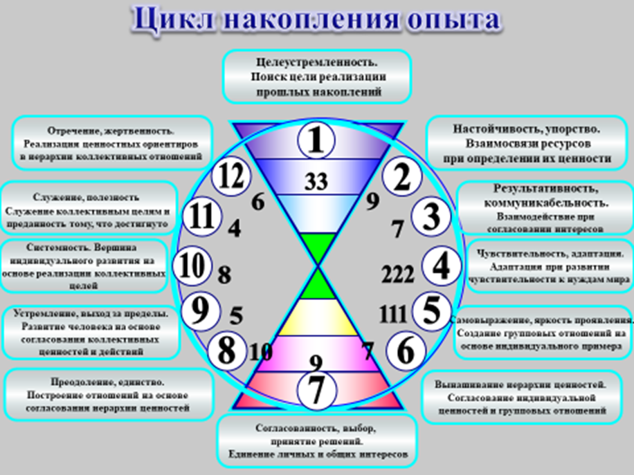 Модель 12 уровней накопления опыта. Как устранить внутриличностные конфликты? На 1 этапе мы выявляем причину конфликта. Ставим правильный вопрос. На 2 этапе привлекаем ресурсы- опытного психолога. На 3 этапе- найти методы решения конфликта. На 4 этапе- мы пытаемся по-новому посмотреть на эту ситуацию, со стороны. На 5 этапе – мы учимся меняться сами, личным примером, показывая как надо выходить из конфликтов. На 6 этапе- учимся учитывать иерархию ценностей семьи. В приоритеты ставить семейные ценности. На 7 этапе – взвешивание своих личных интересов с интересами семьи. Равновесие и правильный выбор между личностными и семейными интересами. На 8 этапе – согласовываем партнерские ценности. Важность и ценность каждого в дополнении друг друга. На 9 этапе- не останавливаемся на достигнутом, а идем дальше, совершенствуемся, развиваемся, изучаем законы развития семьи. На 10 этапе –мы хорошие профессионалы и помогаем членам семьи их развитию. На 11 этапе – каждому члену семьи выполнять свое предназначение. На 12 этапе- понимать роль семьи в развитии рода-народа-общества-планеты.